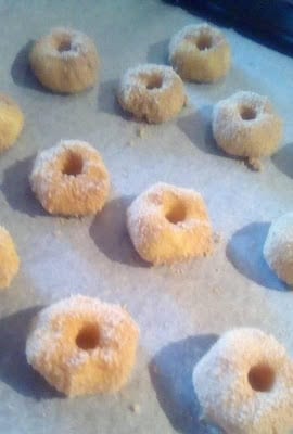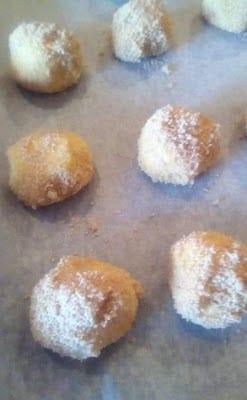 Οπότε στην συνέχεια τα πλάθουμε μπαλάκια σε ότι μέγεθος ίδιο θέλουμε τα βουτάμε γάλα,σιμιγδάλι,η φρυγανιά τα τοποθετούμε στην λαδόκολλα στο ταψί και τα τρυπάμε με το δάχτυλο γίνονται και χωρίς να τα τρυπήσουμε. Τα ψήνουμε στους 200 βαθμούς για 15 λεπτά στον φούρνο μας-προθερμασμένο.