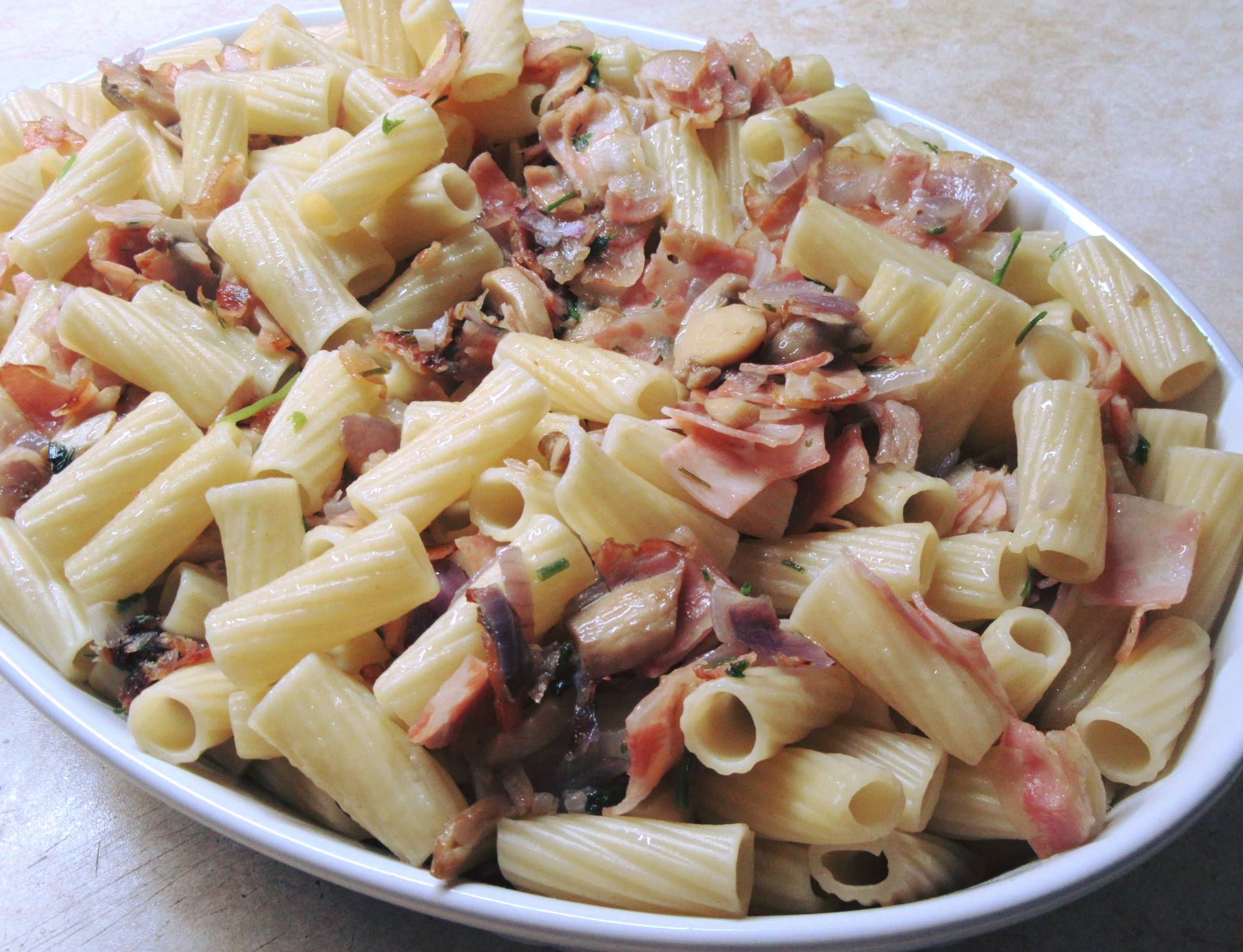 Εβρασα τα μακαρονια σε αλατονερο και τα εβαλα μεσα στο πυρεξ τα ανακατεψα με σκληρο τυρι Δανιας ..μια κουπα !! τσιγαρισα λιγο το κρεμμυδι μπεικον και τα μανιταρια.. ανακατεψα ολα μαζι μεσα στο πυρεξ!! Σε ενα μπολ χτυπησα τα δυο μου αυγα και ανακατεψα με την κρεμα γαλακτος και τα εριξα μεσα στο πυρεξ …Πασπαλισα με τυρι γκουντα και εψησα μεχρι να κανει μια ωραια κρουστα απο πανω .περιπου 30 λεπτα οχι περισσοτερο να μην στεγνωσει τελειως το φαγητο!!
