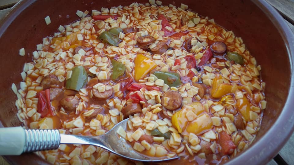 Σε ένα αντικολλητικό τηγάνι σοτάρω αρχικά με το λαδάκι μου τα λουκάνικα αφού τα έχω κόψει ροδέλες. Ψιλοκόβω το κρεμμύδι και το σκόρδο και προσθέτω. Κόβω σε χοντρά κομμάτια τις πιπεριές μου και τις προσθέτω στο τηγάνι.Τις γυρίζω ίσα να γυαλίσουν. Σβήνω με το κρασί και αφήνω να εξατμιστεί. Προσθέτω τα μπαχαρικά μου τη τριμμένη ντομάτα το αλάτι και το πιπέρι!!!!! Ωστόσο έχω προθερμάνει το φούρνο μου στους 220 βαθμούς. Προσθέτω το νεράκι μου και περιμένω να πάρει μια βράση. Γυρίζω στην πήλινη γάστρα , σκεπάζω και το βάζω στο φούρνο. Ψήνω για 40 λεπτά και προσθέτω το χυλοπιτάκι. Ψήνω για 10 λεπτά περίπου και βγάζω από το φούρνο. Αφήνω να τραβήξει τα υγρά του. Σερβίρω με μπόλικο τυράκι και μπυριτσα παγωμένη!!!!
