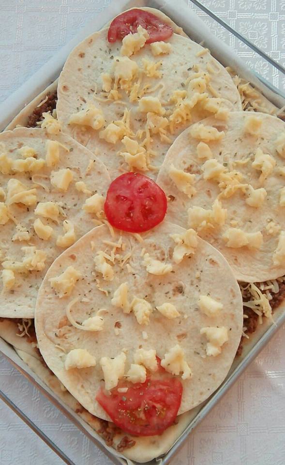 Προθερμένουμε τον φούρνο στους 170 βαθμούς. Στρώνουμε την ζύμη σε ένα ταψί και ανοίγουμε επάνω το φύλλο καλά με λίγο λάδι στα χέρια μας. Ρίχνουμε και τον κιμά από επάνω και πασπαλίζουμε την επιφάνεια με τριμμένο τυρί ( όσο θέλουμε ). Αραδιάζουμε από επάνω και τις τορτιγες και ξανά κασέρι ή τυρί αρεσκείας μας από επάνω. Ψήνουμε την πίτσα για 30 λεπτά ( αναλόγως τον φούρνο) να ροδίσει καλά η επιφάνεια. Την βγάζουμε από τον φούρνο και την αφήνουμε για ένα 10 λεπτό να σταθεί και μετά σερβίρουμε.