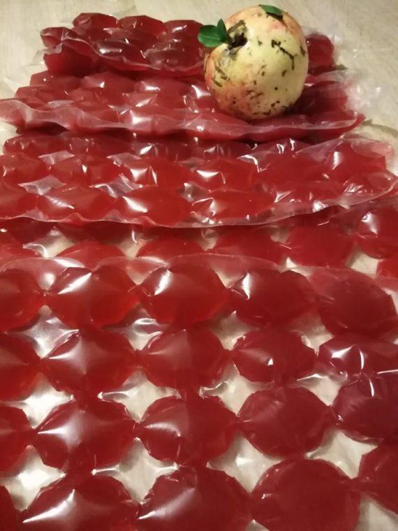 Έστυψα τα ρόδια στο λεμονοστύφτη και μετά σούρωσα με ένα τούλι. Έβαλα τον χυμό σε παγοκυψέλες για να γίνουν παγάκια.