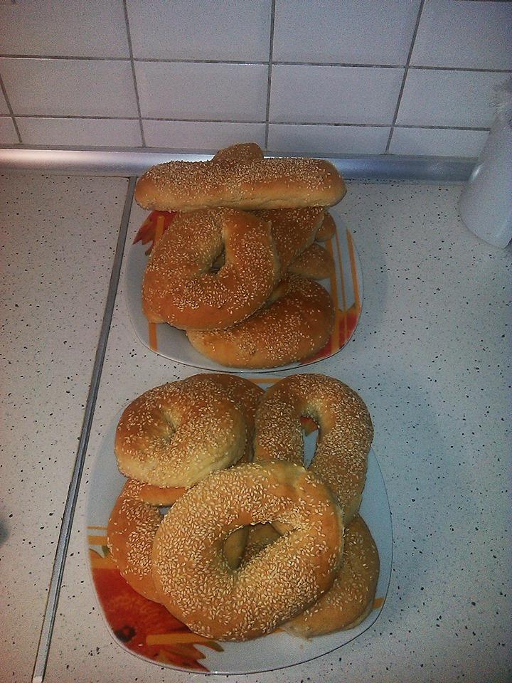 Ζυμώνουμε όλα μαζί για 10 λεπτά μέχρι να γίνει μια ωραία ζύμη. Χωρίζουμε σε μπαλιτσες, εμένα βγήκαν 13 και πλάθουμε κουλούρια. Τα βουτάμε πρώτα σε νερό και μετά σε σουσάμι. Τοποθετούμε σε ταψί με λαδόκολλα και αφήνουμε 20 λεπτά να φουσκώσουν. Ψήνουμε στους 200 για 20-25 λεπτά.
