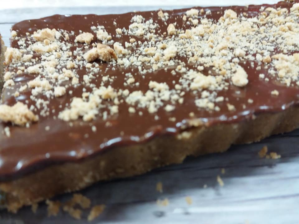 Θρυμματίζουμε τα μπισκότα στο μούλτι και τα ανακατεύουμε με το βούτυρο. Τα στρώνουμε καλά σε μακρόστενη ταρτιέρα με αποσπώμενα πλαϊνά. Ζεσταίνουμε την κρέμα γάλακτος και τη ρίχνουμε πάνω στη σπασμένη κουβερτούρα ανακατεύοντας συνεχώς μέχρι να λιώσει και να γίνει λείο το μείγμα. Το ρίχνουμε πάνω στη βάση και με ένα κουταλάκι το απλώνουμε προσεκτικά ώστε να πάει παντού. Πασπαλίζουμε με θρυμματισμένα μπισκότα και τη βάζουμε στο ψυγείο για τουλάχιστον δύο ώρες πριν την ξεφορμάρουμε και την κόψουμε.