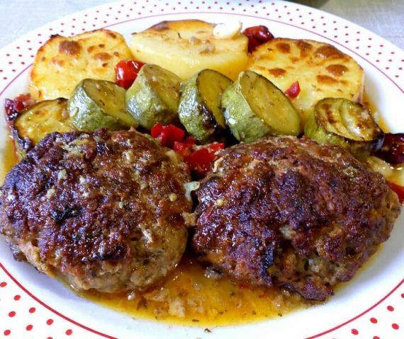 Σήμερα έχουμε μπιφτέκια αφράτα και πεντανόστιμα με πατάτες κολοκυθάκια ντοματίνια και σκορδάκι.