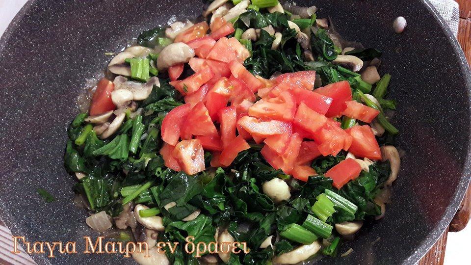 Καθαρίζουμε και πλένουμε καλά το σπανάκι. Το κόβουμε σε πάχος 3 εκ περίπου. Σε ένα βαθύ τηγάνι βάζουμε το ελαιόλαδο με το κρεμμύδι χοντροκομμένο να σοταριστεί. Προσθέτουμε χοντροκομμένα τα μανιτάρια. Όταν μαραθούν και τα μανιτάρια ρίχνουμε το σπανάκι την ντομάτα σε κύβους και αλατοπίπερο.