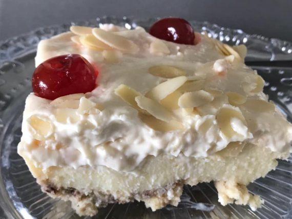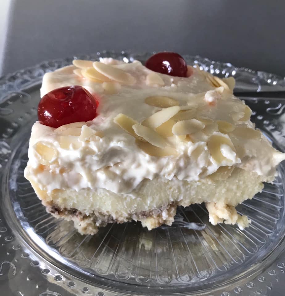 ΕΚΤΕΛΕΣΗ Στρώνουμε σαβαγιάρ βρεγμένα σε γάλα σε ταψάκι. Χτυπάμε δυο κρέμες στιγμής με το ανάλογο γάλα— εγώ έριξα μέσα λιγάκι μαστίχα γιατί αγαπώ τη γεύση της— τη στρώνουμε από πάνω . Μετά χτυπάμε μια Μόρφατ με ένα ζαχαρούχο στρώνουμε και αυτή και διακόσμησα με κερασάκια γλυκό και φιλέ αμύγδαλο !!
