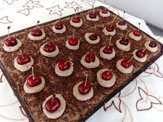 Στρώνουμε το πρώτο παντεσπάνι στο ταψί ή σε πιατέλα. Βρέχουμε ελαφρά με σιρόπι (με πινέλο).Απλώνουμε την 1η κρέμα. Τοποθετούμε το 2ο παντεσπάνι, σιρόπι και από πάνω τη 2η κρέμα. Στρώνουμε το 3ο παντεσπάνι, ραντίζουμε με σιρόπι και καλύπτουμε με την 3η κρέμα. Πασπαλίζουμε με τρούφα σοκολάτας, κάνουμε ροζέτες με λίγη από την 3η κρέμα και διακοσμούμε με κερασάκια.