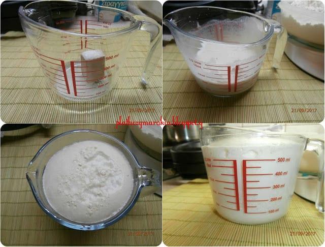 - Ανακατεύουμε σε ένα μπολάκι τη μαγιά με ένα κουταλάκι του γλυκού ζάχαρη και την διαλύουμε με ένα κουτάλι της σούπας χλιαρό γάλα (προσέξτε να μην είναι καυτό γιατί θα καεί η μαγιά )