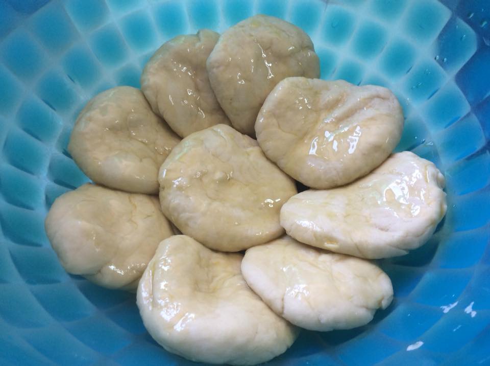 Χωρισα τη ζυμη σε εννεα κοματια ,τα λαδωσα και τα αφησα μια ωρα . Μετα τα επλασα μακροστενα φυλλα και τους εβαλα γεμιση.ο Να πω εδω,οτι πλαθονται πολυ ευκολα ακομη και με το χερι και ειναι πολυ ελαστική η ζυμη,αν την τραβήξεις με προσοχη,ανοιγει μια χαρα.