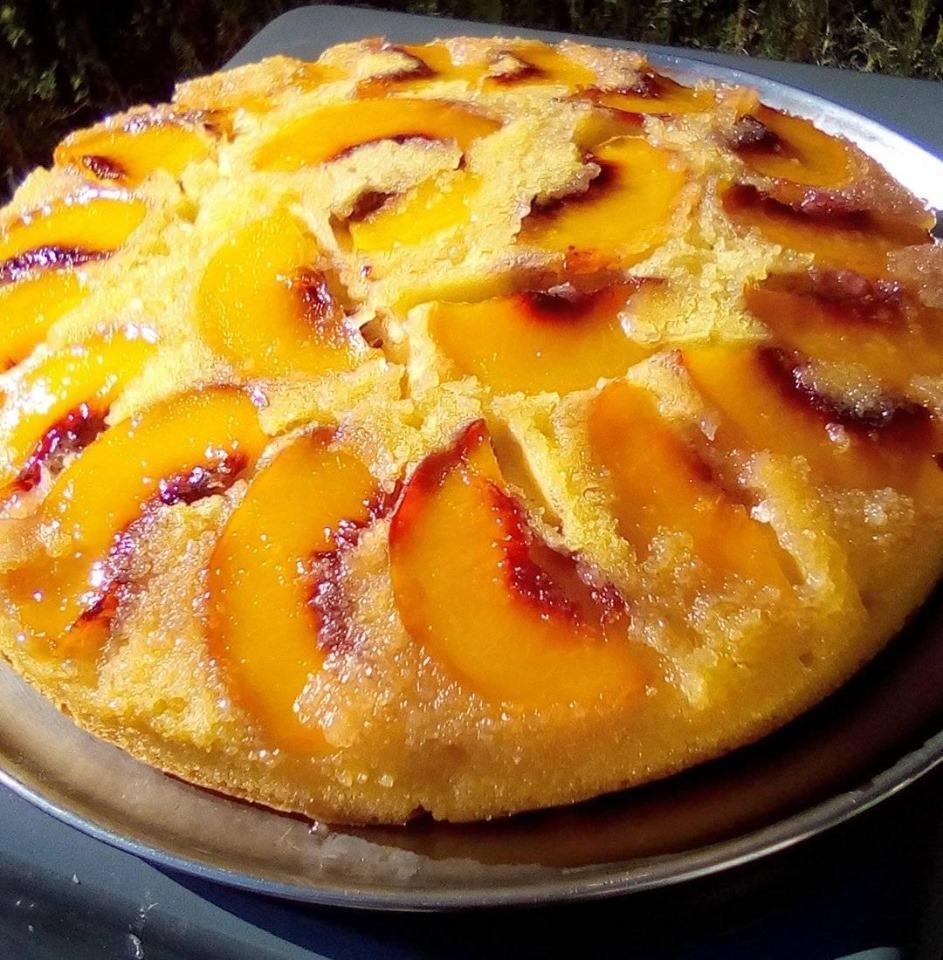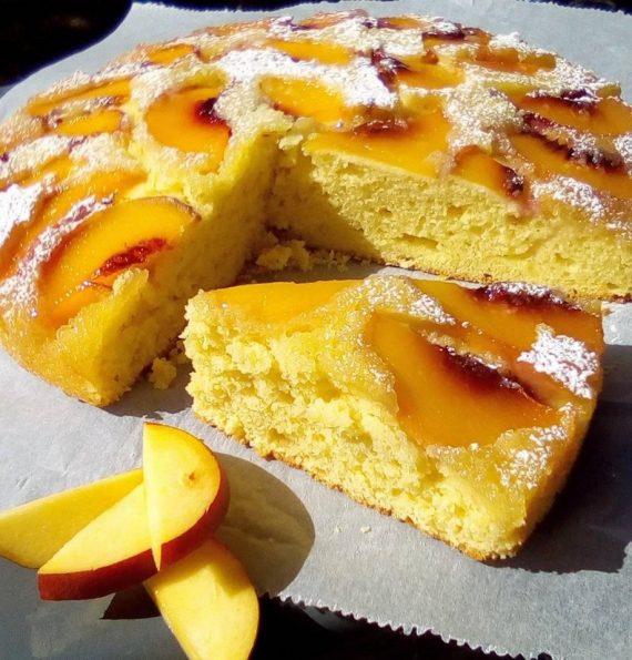 Χτυπάμε τα αυγά με την ζάχαρη και τις βανίλιες να αφρατέψουν ώστε να στέκεται το μείγμα. Προσθέτουμε το γάλα,το σπορέλαιο και σιγά σιγά το αλεύρι. Τοποθετούμε στο ταψί μας νούμερο 30 λαδόκολλα πάνω στην λαδόκολλα βάζουμε 125 γραμμάρια ζάχαρη και το ισιώνουμε καλά παντού. Πάνω στην ζάχαρη τοποθετούμε φέτες ροδάκινο. Πάνω στα ροδάκινα τοποθετούμε το μείγμα και το ισιώνουμε. Το τοποθετούμε σε προθερμασμένο φούρνο στους 180 βαθμούς και το ψήνουμε στις αντιστάσεις στη μεσαία σχάρα για 45 λεπτά και 5 λεπτά με σβησμένο φούρνο. Όταν το βγάλουμε το αφήνουμε ένα τέταρτο σε θερμοκρασία δωματίου και στην συνεχεία το αναποδογυρίζουμε και βγάζουμε με προσοχή την λαδόκολλα τέλος πασπαλίζουμε με άχνη ζάχαρη!