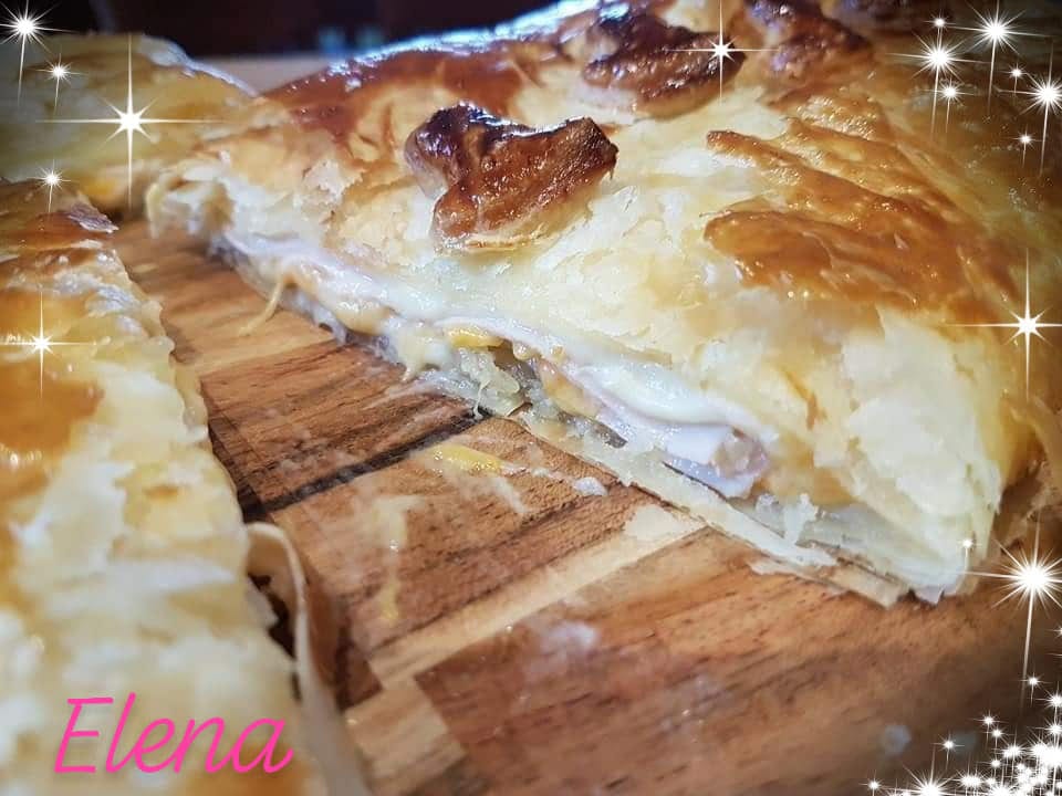 1 σφολιάτα Φέτες ζαμπόν ή γαλοπούλα Φέτες τυρί γκούντα Τριμμένο τσενταρ ή ότι αλλο θελετε Μπεσαμελ Κρόκο από ένα αυγο