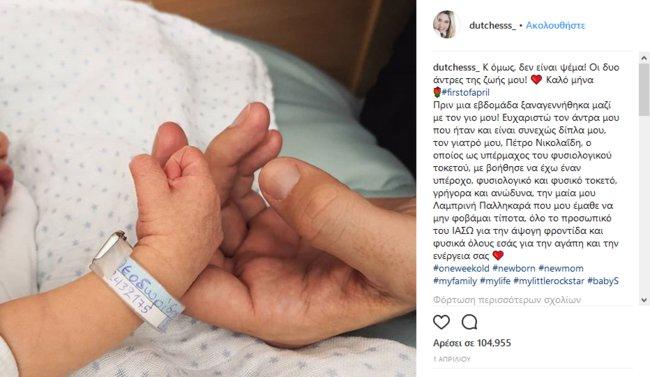 Λίγες ώρες μετά τη γέννησή του γιου της, η Κατερίνα Καραβάτου πόσταρε αυτή τη φωτογραφία όπου δεν βλέπουμε το μουτράκι του, αλλά γενικώς έτσι είθισται στην ελληνική σόουμπιζ.