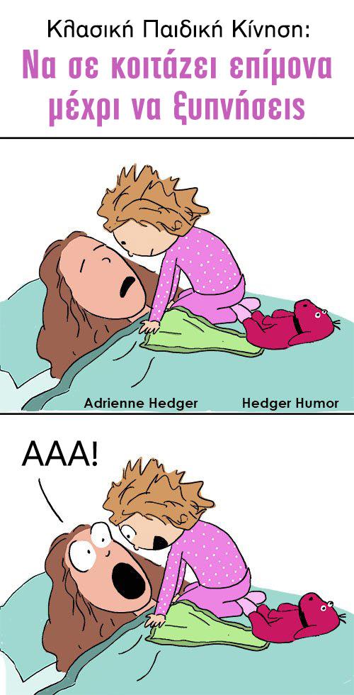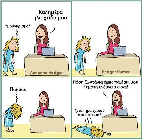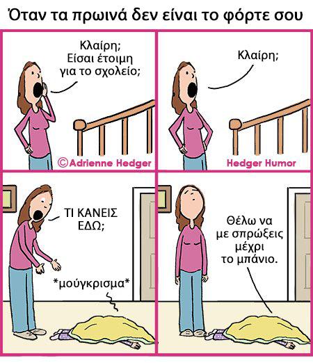 Η φοβερή σκιτσογράφος Adrienne Hedger δημιουργός της σελίδας Hedger Humor, δεν θα μπορούσε να περιγράψει με πιο ρεαλιστικό τρόπο το πρωινό ξύπνημα κάθε μαμάς με μικρά παιδιά…