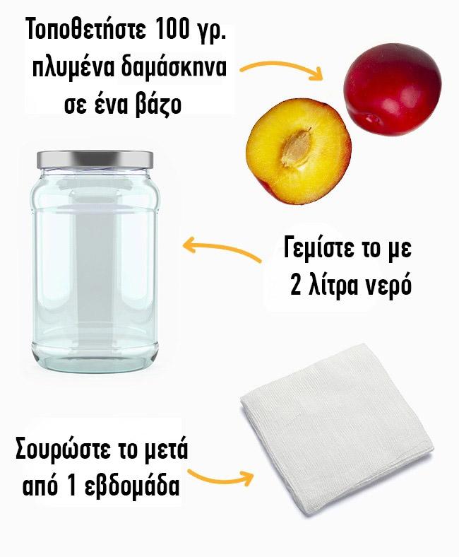 Τα δαμάσκηνα απομακρύνουν τις τοξίνες, επιταχύνοντας την απώλεια βάρους. Περιέχουν βιταμίνη Α, κάλιο, μαγνήσιο και σίδηρο, για να μας κρατήσουν σε φόρμα. Μην πίνετε περισσότερο από ένα ποτήρι την ημέρα, καθώς τα δαμάσκηνα είναι ένα ισχυρό καθαρτικό.
