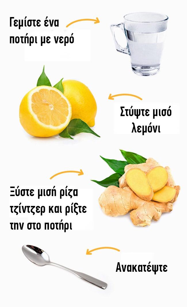 Πολλοί διαιτολόγοι θεωρούν ότι το τζίντζερ είναι ένα εξαιρετικό συστατικό για την απώλεια βάρους, μιας και ανακουφίζει από το πρήξιμο, βοηθώντας στην απομάκρυνση του περίσσιου υγρού από το σώμα. Επιπλέον, τα λεμόνια διεγείρουν τα νεφρά, υποστηρίζουν την απομάκρυνση τοξινών και ρυθμίζουν την πέψη.