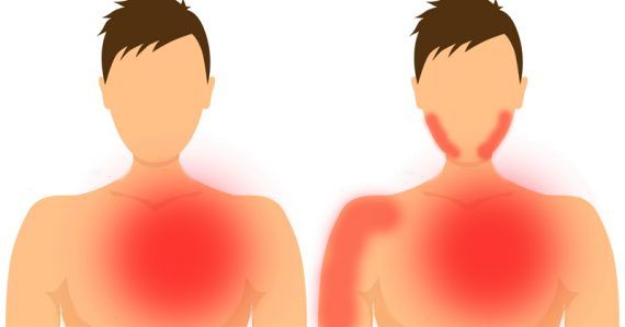 - Ως γενικός κανόνας, ο πόνος εμφανίζεται στο κέντρο του θώρακα. Αυτός μπορεί να κινηθεί προς τα κάτω κατά μήκος του αριστερού βραχίονα και κατά μήκος της πλάτης.