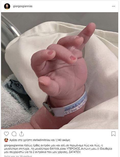 «Καλώς ήρθες αντράκι μου και εσύ..σε περιμέναμε πώς και πώς.. η μεγαλύτερη επιτυχία , το μεγαλύτερο ΘΑΥΜΑ..είσαι ΥΠΕΡΟΧΟΣ..Αντώνη μου..!!! Ελευθερία μου σ’ευχαριστώ για τα 2 αντράκια που μου χάρισες.. ΣΑΓΑΠΩ!!», έγραψε ο Γιώργος Γιαννιάς.