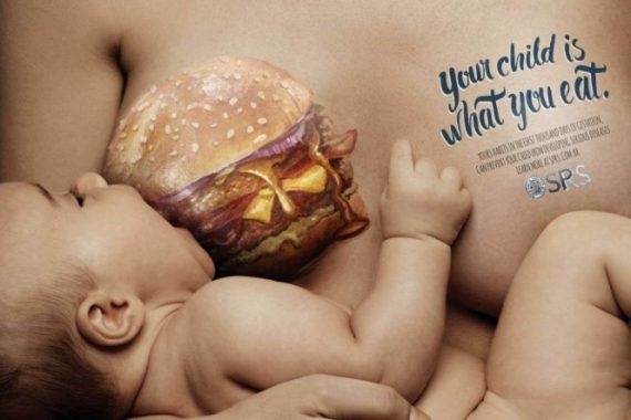 Μια διαφημιστική καμπάνια που έγινε από την Βραζιλιάνικη Παιδιατρική Εταιρεία του Ρίο Γκράντε (SpRs) εγίνε σε πολύ σύντομο χρονικό διάστημα viral ,αφού η διαφήμιση και το μότο της πραγματικά τα σπάει! Η SpRs ανέθεσε στη Βραζιλιάνικη διαφημιστική Paim να δημιουργήσει μια εκστρατεία για να τονίσει τις επιπτώσεις που έχει η διατροφή της μητέρας στο αγέννητο παιδί της και στο θηλασμό. Η εκστρατεία περιλαμβάνει τρεις εικόνες από τις θηλάζουσες μητέρες, όπου κάθε μητέρα έχει ενα διαφορετικό junk food ή το ποτό ζωγραφισμένα στο στήθος της ετσι ώστε να μοιάζει ότι το μωρό καταναλώνει άμεσα αυτά τα τρόφιμα.