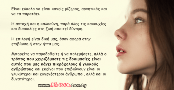 Οι ευγενέστεροι άνθρωποι δε γεννιούνται έτσι- έχουν διαμορφωθεί έτσι μέσω των επιλογών που έκαναν κατά τη διάρκεια των δοκιμασιών. Έχουν αντέξει τις δυσκολότερες καταιγίδες χωρίς να πνιγούν, γι’ αυτούς, όλα είναι πιθανά. Είναι εύκολο να είναι κανείς μίζερος, αρνητικός και να τα παρατάει. Η αντοχή και η καλοσύνη, παρά όλες τις κακουχίες και δυσκολίες στη ζωή απαιτεί δύναμη. Η επιλογή είναι δική μας, όσον αφορά στην επιβίωση ή στην ήττα μας. Μπορείτε να παραδοθείτε ή να πολεμήσετε, αλλά ο τρόπος που χειριζόμαστε τις δοκιμασίες είναι αυτός που μας κάνει πικρόχολους ή γλυκούς ανθρώπους και εκείνοι που επιβιώνουν είναι οι γλυκύτεροι και ευγενέστεροι άνθρωποι, αλλά και οι δυνατότεροι.