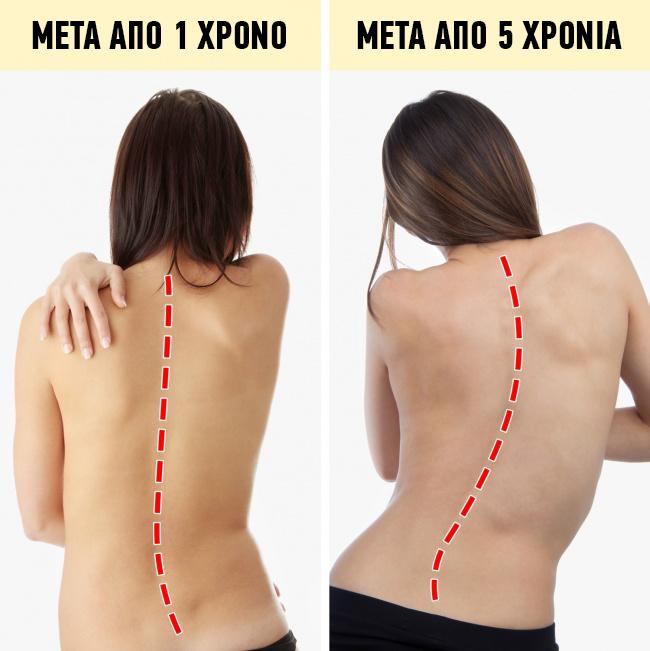 Όταν κάθεστε, η ένταση μεταφέρεται στη λεκάνη και στην σπονδυλική στήλη, προκαλώντας αύξηση της πίεσης στους μεσοσπονδύλιους δίσκους. Η επίμονη καταπόνηση προκαλεί την παγίδευση των αυχενικών σπονδύλων και μπορεί τελικά να οδηγήσει στη μείωση της ροής του αίματος στον εγκέφαλο. Ως αποτέλεσμα, ένα άτομο μπορεί να βιώσει πονοκεφάλους και θολή όραση. Η σπονδυλική στήλη είναι ένα πλαίσιο για όλα τα εσωτερικά όργανα, γι ‘αυτό είναι ζωτικής σημασίας να διατηρείται ευθεία χωρίς να ασκεί συνεχή πίεση σε αυτά.