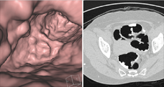 Τα επίπεδα ακτινοβολίας από μια ενιαία εικονική κολονοσκόπηση είναι παρόμοια με την έκθεση σε ατομικές βόμβες στη Χιροσίμα, αν και σύμφωνα με το Εθνικό Ινστιτούτο Καρκίνου: «Δεν είναι ακόμη γνωστό αν η εικονική κολονοσκόπηση μπορεί να μειώσει τον αριθμό των θανάτων από καρκίνο του παχέος εντέρου».