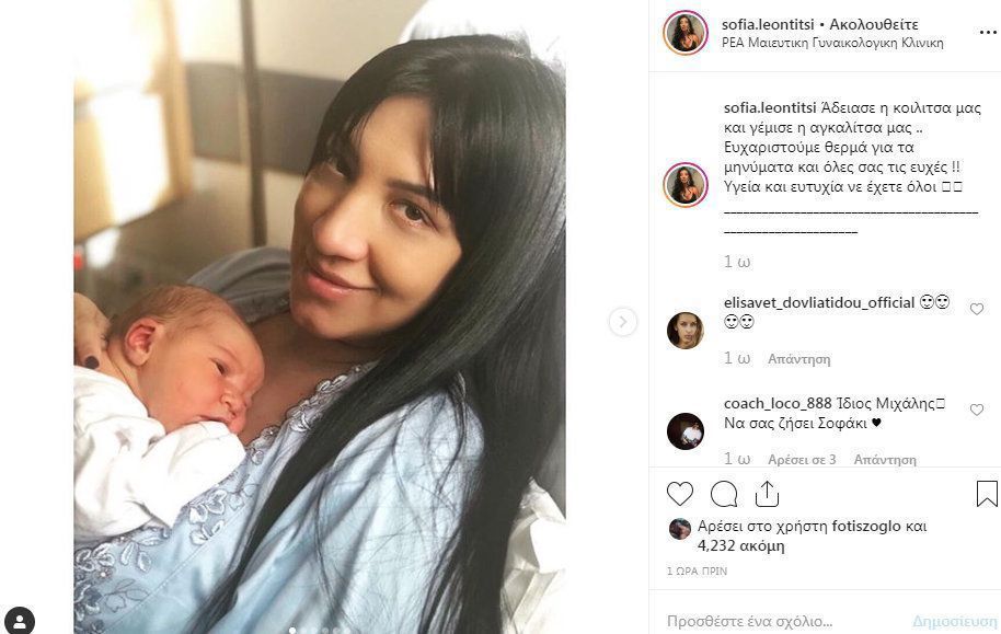 Η όμορφη Σοφία, μάλιστα νωρίτερα πόσταρε στον προσωπικό της λογαριασμό στο Instagram την πρώτη φωτογραφία που την βλέπουμε να ποζάρει για πρώτη φορά με τον γιο της. «Άδειασε η κοιλίτσα μας και γέμισε η αγκαλίτσα μας .. Ευχαριστούμε θερμά για τα μηνύματα και όλες σας τις ευχές !! Υγεία και ευτυχία να έχετε όλοι ??», σημείωσε στη λεζάντα κι έγινε χαμός από likes και σχόλια.