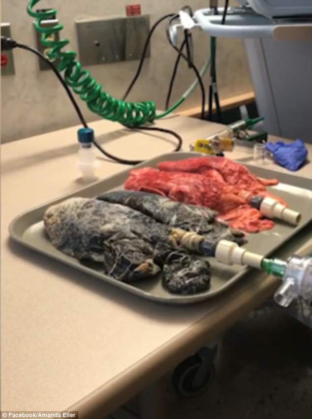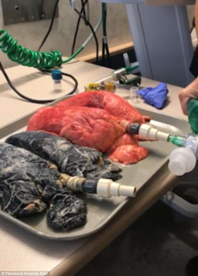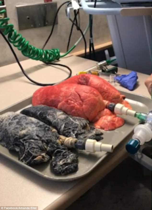 Το βίντεο δημοσιεύτηκε από την νοσοκόμα Αμάντα Έλλερ και δείχνει τους μαύρους πνεύμονες ενός καπνιστή που δεν μπορούν να διογκωθούν σωστά.