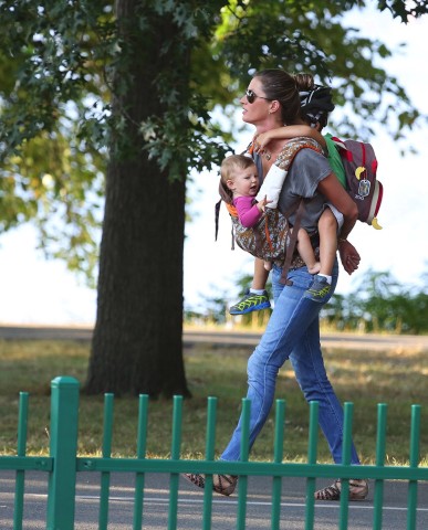 Η Ζιζέλ κρατά αγκαλιά και τα δύο, είναι ζωσμένη με παιδικές τσάντες, έχει πρόχειρο κότσο αλλά δεν χάνει το χαμόγελό της