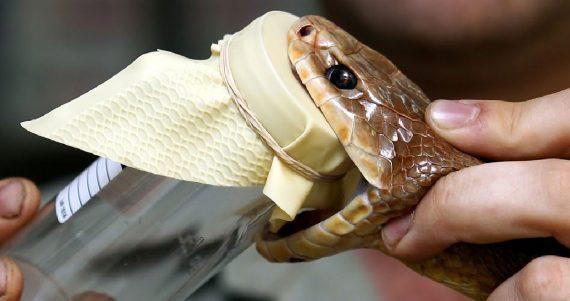 Προσεκτικά βγάζουν το φίδι από το μέρος που το έχουν, το πιάνουν από το πάνω μέρος του κεφαλιού και πλησιάζουν προς το ειδικό (για δάγκωμα) πλαστικό κουτί, στο οποίο το φίδι και θα στάξει το δηλητήριο του, αλλά και δεν θα τραυματίσει τα δόντια του αφού μετέπειτα θα το ξαναχρησιμοποιήσει, όταν ο οργανισμός του παράξει νέο δηλητήριο.
