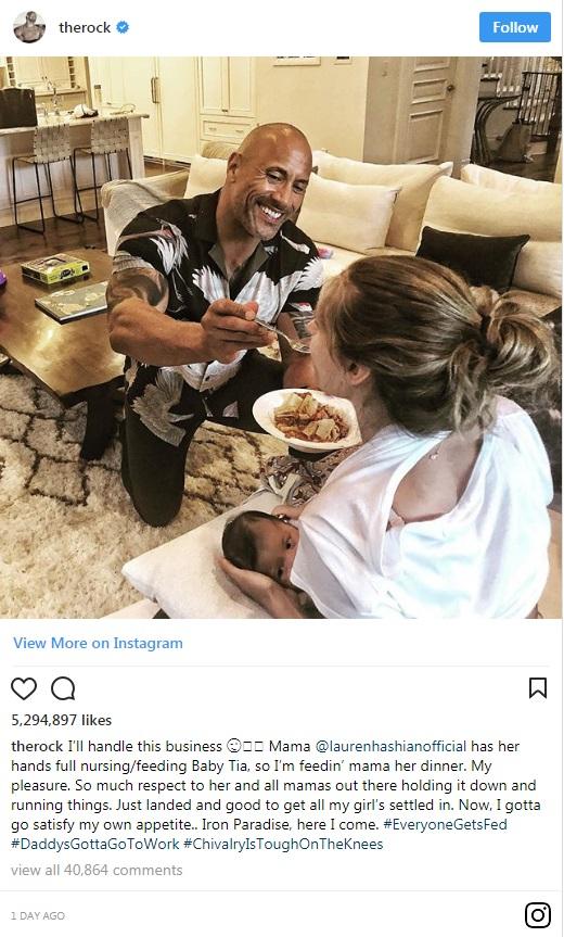 Στη τρυφερή φωτογραφία που δημοσίευσε ο διάσημος ηθοποιός και πανευτυχής μπαμπάς ταΐζει τη σύντροφό του Lauren ενώ εκείνη θηλάζει την νεογέννητη κόρη τους. Το μήνυμα που συνόδευσε αυτή τη φωτογραφία είναι εξίσου χαριτωμένο και αποδεικνύει ότι όταν οι μπαμπάδες θέλουν, μπορούν να κάνουν το έτερό τους ήμισυ να νιώθει ευτυχία που ένωσαν τις ζωές τους και έγιναν γονείς. «Θα αναλάβω εγώ αυτή τη δουλειά! Η μαμά έχει τα χέρια της γεμάτα, φροντίζοντας/ ταΐζοντας την μικρή Tia, οπότε εγώ δίνω στη μαμά το φαγητό της. Ευχαρίστησή μου. Τόσος σεβασμός σε εκείνη και όλες τις μαμάδες εκεί έξω που κάνουν διάφορα. Μόλις προσγειώθηκα και φροντίζω όλα μου τα κορίτσια να είναι τακτοποιημένα. Τώρα πρέπει να ικανοποιήσω και τη δική μου όρεξη…Iron Paradise, σου ‘ρχομαι», έγραψε στο μήνυμά του ο ηθοποιός.
