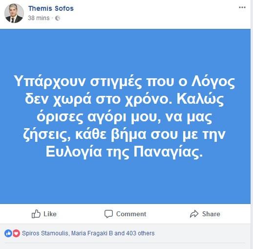 Συγκεκριμένα ο Θέμης Σοφός το μεσημέρι της Παρασκευής έγραψε στον προσωπικό του λογαριασμό στο Facebook: «Υπάρχουν στιγμές που ο λόγος δεν χωρά στον χρόνο. Καλώς όρισες αγόρι μου, να μας ζήσεις. Κάθε βήμα σου με την ευλογία της Παναγίας».