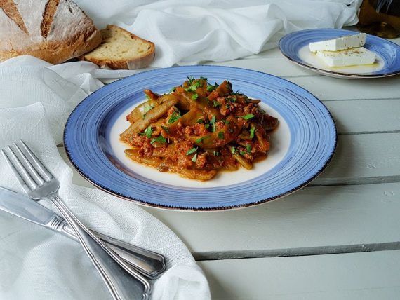 Ένα πολύ ωραίο και νόστιμο πάντρεμα από φασολάκια και κιμά φωτογραφημένο από εμένα με χρώματα ελληνικά! Ένα πιάτο που μπορούμε να συνοδεύσουμε με υπέροχη σάλτσα γιαουρτιού ή με την πολυαγαπημένη μας φέτα και φυσικά ζυμωτό ψωμί! Φασολάκια με κιμά και σάλτσα γιαουρτιού. Υλικά: • 1 κιλό φρέσκα φασολάκια μπαρμπούνια, καθαρισμένα, ζεματισμένα και στραγγισμένα. • 500 γρ. κιμά μοσχαρίσιο • 1 μεγάλο κρεμμύδι ψιλοκομμένο • 2 σκελίδες σκόρδο ψιλοκομμένες • 1 μικρό καρότο τριμμένο • 400 γρ. φρέσκια ντομάτα αποφλοιωμένη και ψιλοκομμένη • 1 κ.σ πελτέ ντομάτας • ½ φλ. Ελαιόλαδο • 1 ποτήρι κρασί λευκό ξηρό • 1 ½ φλ. ζωμό κρέατος • 2 κ.σ μαϊντανό ψιλοκομμένο • 1 πρέζα κανέλα • ½ κ.γ μπαχάρι • Λίγη ζάχαρη • Αλάτι-πιπέρι Για τη σάλτσα γιαουρτιού: • 400 γρ. γιαούρτι στραγγιστό • 1 σκελίδα σκόρδο λιωμένο • 1-2 κ.σ μαϊντανό ψιλοκομμένο • Αλάτι-πιπέρι Εκτέλεση: • Βάζουμε μια κατσαρόλα σε μέτρια προς δυνατή φωτιά και ζεσταίνουμε το μισό ελαιόλαδο. • Προσθέτουμε το κρεμμύδι με το καρότο και σοτάρουμε μέχρι να μαραθούν. • Στη συνέχεια προσθέτουμε το σκόρδο με τον κιμά και σοτάρουμε για 4’-5’ ακόμα μέχρι να “ασπρίσει” ο κιμάς. • Σβήνουμε με το κρασί, αφήνουμε να εξατμιστεί η αλκοόλη και έπειτα προσθέτουμε τον πελτέ, την ντομάτα, τη ζάχαρη, το μπαχάρι, την κανέλα και το υπόλοιπο ελαιόλαδο και σιγοβράζουμε για 10’. • Προσθέτουμε στον κιμά τα ζεματισμένα φασολάκια, το ζωμό, αλάτι και πιπέρι, ανακατεύουμε ελαφρά και σιγοβράζουμε για 30’-40’ λεπτά ενώ 5’ πριν αποσύρουμε από τη φωτιά προσθέτουμε και τον μαϊντανό. • Κατά τη διάρκεια του μαγειρέματος ελέγχουμε το φαγητό και αν χρειαστεί ανακινούμε την κατσαρόλα ώστε να ανακατέψουμε ελαφρά. Αν είναι απαραίτητο συμπληρώνουμε λίγο ζωμό η νερό. Εκτέλεση για τη σάλτσα γιαουρτιού: Βάζουμε σε ένα μπολ όλα τα υλικά και ανακατεύουμε καλά. Όταν το φαγητό είναι έτοιμο σερβίρουμε βάζοντας από πάνω λίγη από τη σάλτσα γιαουρτιού ή τριμμένη φέτα.