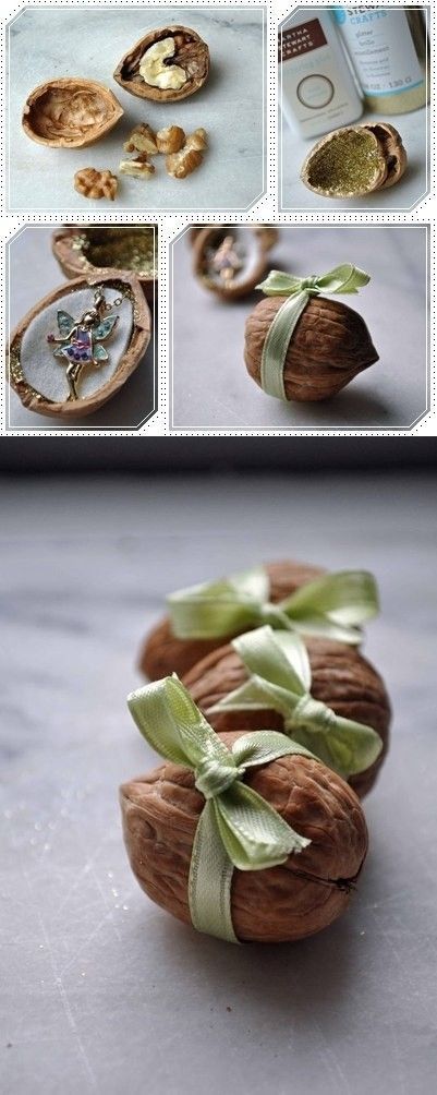 Ανοίξτε ένα καρύδι στην μέση,καθαρίστε τον καρπό και βάψτε με χρυσόσκονη το εσωτερικό του ή κολλήστε δαντέλα.Τοποθετείστε μέσα ένα μενταγιόν ή ότι άλλο εσείς θέλετε.