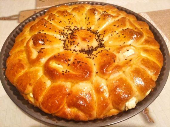 Στην συνέχεια χωρίζουμε την ζύμη μας σε μπαλάκια που έχουν διάσταση 20 εκ. Κόβουμε στην μέση τα μπαλάκια, από τις δύο άκρες και βάζουμε στην μέση την γέμιση του πατημένου τυριού. Μαζεύουμε το πρώτο προς το κέντρο και από την άλλη πλευρά προς το κέντρο.