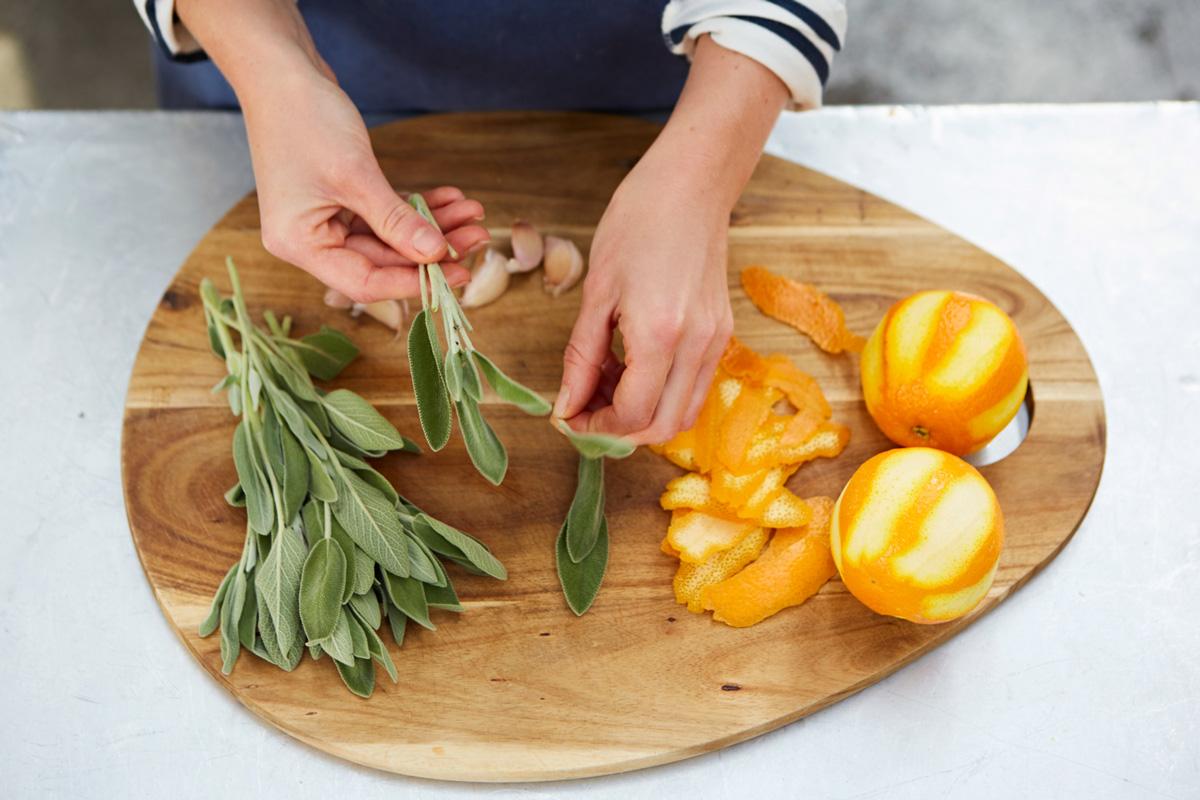 Τσιγαρίστε για 30 δευτερόλεπτα σε ένα τηγάνι σε μέτρια φωτιά τα φύλλα του φασκόμηλου, τις φλούδες που κόψατε από τα πορτοκάλια και τις σκελίδες σκόρδου.