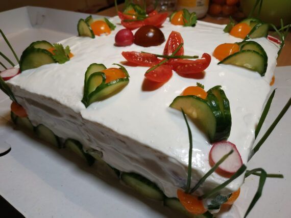 Απλώνουμε από πάνω την σώς που έμεινε και προσέχουμε να καλύψουμε με την σώς όλη την επιφάνεια της τούρτα. Διακοσμούμε με φέτες αγγουριού το οποίο το έχουμε πλύνει καλά και έχουμε κρατήσει τις φλούδες του, ντοματίνια κομμένα στη μέση προαιρετικά και σχοινόπρασο. Αφού παγώσει καλά η τούρτα απολαμβάνουμε.