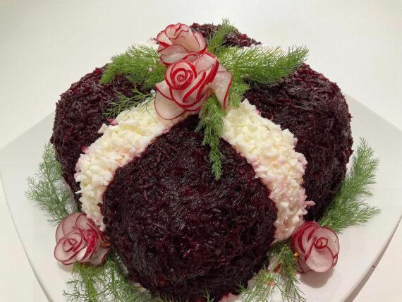 Κόβουμε 2 λωρίδες χαρτί ψησίματος και τις βάζουμε στην επιφάνεια σταυρωτά. Βάζουμε προσεχτικά στις τέσσερις γωνίες τριμμένο παντζάρι, αφαιρούμε τις λωρίδες του χαρτιού και βάζουμε τριμμένα ασπράδια αυγού. Στολίζουμε με λουλούδια που φτιάχνουμε από ραπανάκι και μάραθο προαιρετικά και απολαμβάνουμε.