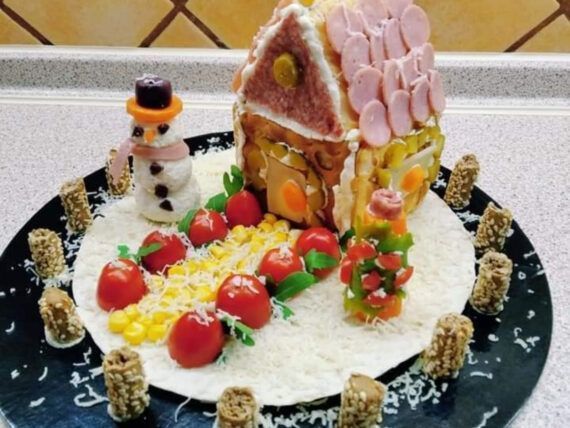Για χερούλι βάζουμε ένα κομμάτι καρότο. Με τον ίδιο τρόπο βάζουμε και το πλαϊνό παράθυρο. Στη σκεπή βάζουμε λίγα καλαμπόκια και κολλάμε με τυρί κρέμα τα στρογγυλά κεραμίδια από ζαμπόν. Τοποθετούμε στην τορτίγια και τον χιονάνθρωπο.