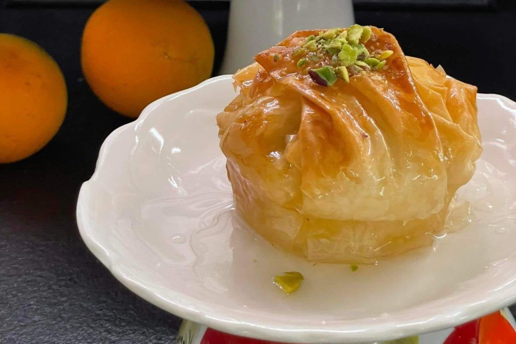 Γεμίζουμε με 1μιση κουταλιά της σούπας από την κρέμα και κλείνουμε το πουγκί με τα δάχτυλά. Βουτυρώνουμε καλά και επαναλαμβάνουμε τη διαδικασία και με τα υπόλοιπα φύλλα. Ψήνουμε στους 170 βαθμούς Κελσίου για 50 λεπτά. Σιροπιάζουμε τα χλιαρά πουγκάκια με κρύο σιρόπι και πασπαλίζουμε με τριμμένο φιστίκι Αιγίνης. Σας άρεσε αυτή η συνταγή; Πείτε μας την γνώμη σας στα σχόλια.