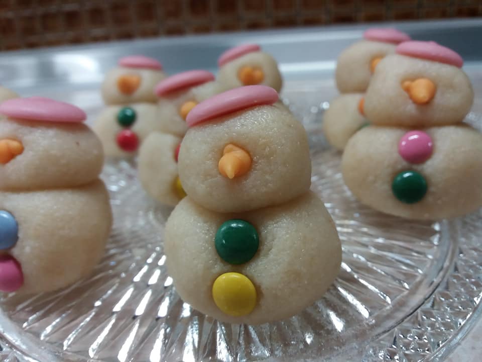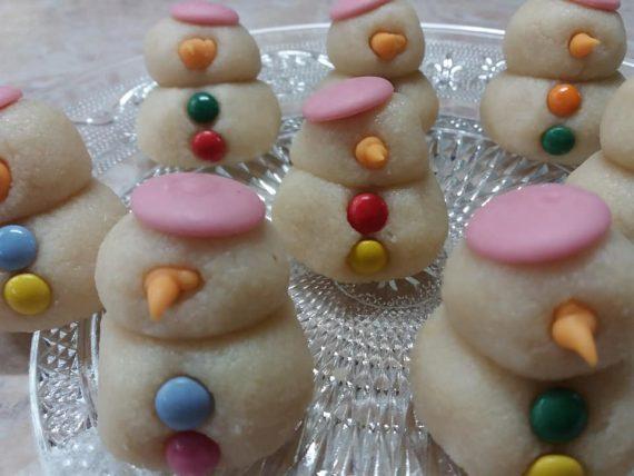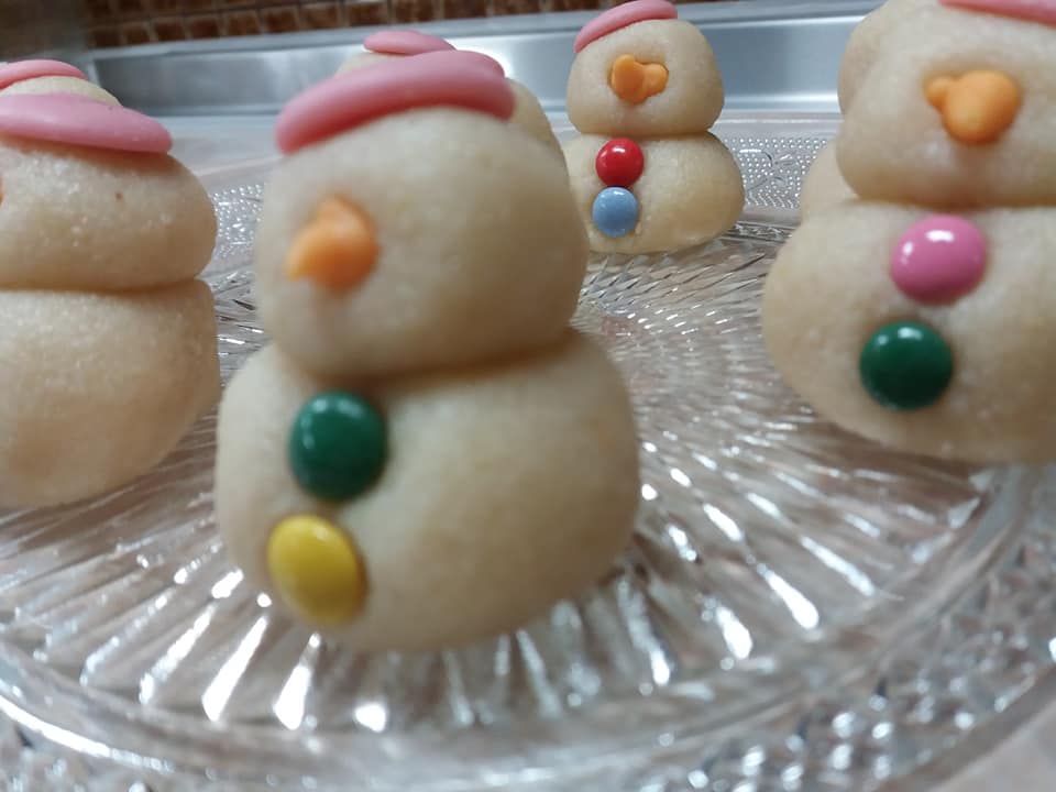 ΕΚΤΕΛΕΣΗ Βάζουμε στο μούλτι τα αμύγδαλα και τη ζάχαρη και τα χτυπάμε όλα μαζί μέχρι να γίνουν σκόνη. Προσθέτουμε το ζαχαρούχο και ανακατεύουμε πολύ καλά ώστε να ομογενοποιηθεί το μείγμα και να σχηματίσει μια ζύμη. Τη βάζουμε σε μεμβράνη και την τοποθετούμε στο ψυγείο για 20 λεπτά. Έπειτα πλάθουμε 16 μπαλίτσες (8 πιο μεγάλες για το σώμα και 8 πιο μικρές για το κεφάλι) και κολλάμε τη μια πάνω στην άλλη. Βάζουμε χρωματιστά κουφετάκια για κουμπιά και σταγόνες σοκολάτας για μύτη και για καπέλο.