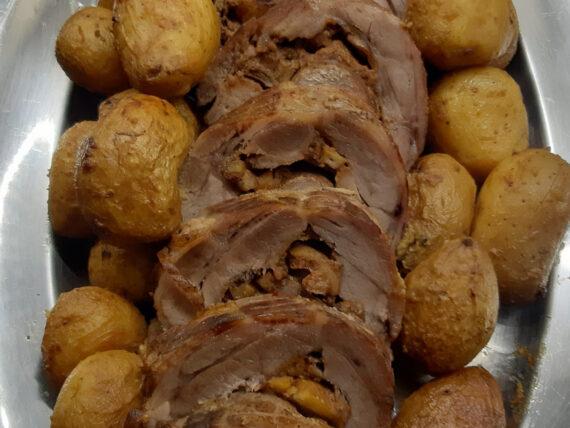 Συνταγή για μαλακό χοιρινό ρολό γεμιστό με δαμάσκηνα και βερίκοκα και συνοδευόμενο με καλομαγειρεμένες πατάτες baby για να γλείφετε και τα δάχτυλά σας στο γιορτινό τραπέζι.
