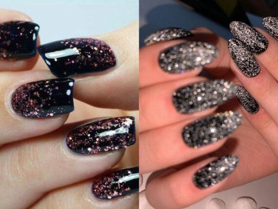 Ιδέες για μαύρα νύχια με γκλίτερ για τα Χριστούγεννα 2023: Όμπρε νύχια με γκλίτερ