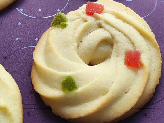 Η αγαπημένη μας Γκόλφω Νικολού μας ετοιμάζει αφράτα μπισκότα βουτύρου που λιώνουν στο στόμα με φρούτα της αρεσκείας μας. Εμείς βάλαμε ακτινίδια και φράουλες, για να γίνουν πιο χρωματιστά και να παραπέμπουν σε Χριστουγεννιάτικα φωτάκια.