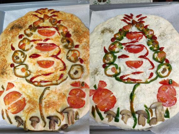 Από πάνω βάζουμε ροδέλες πράσινης και κόκκινης πιπεριάς καθώς και πιπεριάς Φλωρίνης, σχηματίζοντας ένα Χριστουγεννιάτικο δέντρο. Διακοσμούμε με όσα κομμάτια πιπεριάς περισσεύουν, φέτες ντομάτας και μανιτάρια. Ψήνουμε τη φοκάτσια στους 180 βαθμούς Κελσίου μέχρι να ροδίσουν καλά σε ένα ταψί με λαδόκολλα.