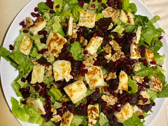 Συνταγή για Χριστουγεννιάτικη, πράσινη σαλάτα με ρόδι, παντζάρι, χαλούμι και βινεγκρέτ μουστάρδας για το Χριστουγεννιάτικο τραπέζι και τον Χριστουγεννιάτικο μπουφέ, που θα συνοδεύσει τέλεια την γεμιστή γαλοπούλα ή το γεμιστό κοτόπουλο.