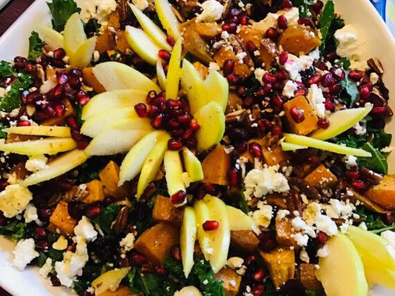 Οι Χριστουγεννιάτικες σαλάτες δεν μπορούν να είναι απλά μία χωριάτικη. Πρέπει να μπλέκουν γιορτινά αρώματα και γιορτινές γεύσεις. Όπως αυτή η υγιεινή και πλούσια Χριστουγεννιάτικη σαλάτα με καρύδια πεκάν, γλυκοπατάτες, μήλο, Kale και μερικά ακόμη υλικά.