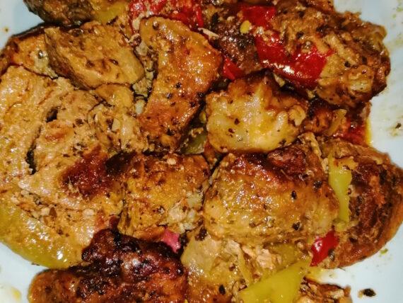 Σε ένα μεγάλο μπολ βάζουμε την χοιρινή σπάλα, τις πράσινες πιπεριές χοντροκομμένες, τις πιπεριές Φλωρίνης χοντροκομμένες, το λευκό κρασί, την σάλτσα σόγιας, το κόκκινο ξύδι, την μουστάρδα, το ηλιέλαιο, την ρίγανη, το πιπέρι, το κάρυ, τη σκόνη σκόρδου, την γλυκιά πάπρικα και τον χυμό λεμονιού.