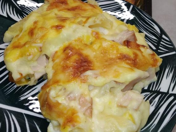 Επίσης βάζουμε την καπνιστή γαλοπούλα ψιλοκομμένη, το γκούντα τριμμένο και την φέτα σπασμένη με τα χέρια μας. Στο τέλος βάζουμε το ελαιόλαδο και ανακατεύουμε πολύ καλά. Βάζουμε το μείγμα σε ένα ταψί και ξεκινάμε να φτιάχνουμε την μπεσαμέλ.