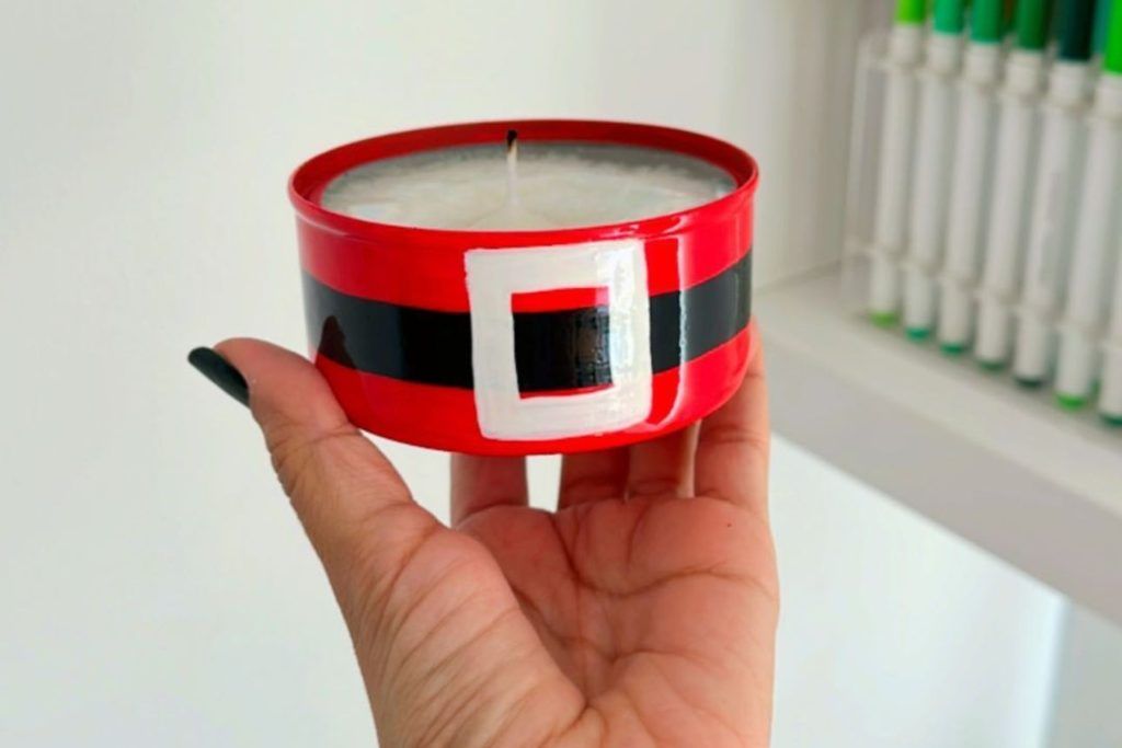 Έπειτα γεμίζεις με το λιωμένο κερί τον τόνο και προσθέσεις ένα φυτίλι. Αφού παγώσει το κερί κόβεις το φυτίλι. Παίρνεις μαύρη τέμπερα ή χρώμα ειδικό για αλουμινένιες επιφάνειες που τα βρίσκεις σε κάθε μαγαζί με χρώματα για το σπίτι και βάφεις τη συσκευασία κόκκινη. Με μαύρο χρώμα ζωγραφίζεις τη ζώνη περιμετρικά της συσκευασίας και με λευκό χρώμα το αξεσουάρ της ζώνης.
