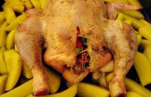 Αφου εχουμε καθαρισει και πλυνει καλα το κοτοπουλο,το αλατοπιπερωνουμε εντος στην κοιλια του.